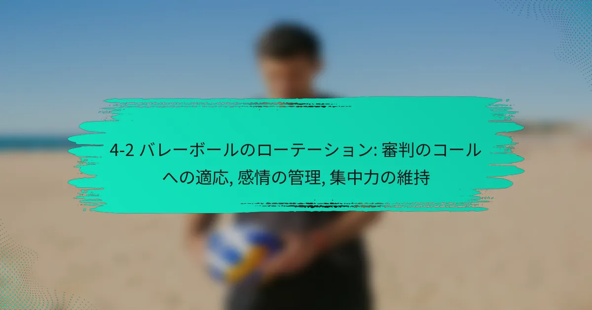 4-2バレーボールローテーションは、4人のフロントロー選手と2人のセッターを特徴とする戦略的なフォーメーションで、ボールの配分と攻撃プレーを最適化します。このセットアップで成功するためには、チームは審判のコールに巧みに適応し、感情を管理し、試合を通じて集中力を維持し、コート上での一体感とレジリエンスのあるパフォーマンスを確保する必要があります。 4-2バレーボールローテーションとは? 4-2バレーボールローテーションは、4人のフロントロー選手と2人のセッターを利用するフォーメーションです。このセットアップは、効果的なボール配分と攻撃戦略を可能にし、さまざまなスキルレベルのチームに人気があります。 4-2ローテーションの定義と構造 4-2ローテーションは、バックローに2人のセッター、フロントローに4人のアタッカーで構成されています。セッターは交互にボールをセットし、フロントロー選手は攻撃とブロックに集中します。この構造により、迅速な移行とバランスの取れた攻撃アプローチが可能になります。 このローテーションでは、選手は自分のポジションと責任を意識する必要があり、攻撃と防御の役割を頻繁に切り替えます。コミュニケーションは、誰がボールをセットするか、いつ切り替えるかを全員が理解するための鍵です。 4-2フォーメーションにおける選手のポジションと役割 4-2フォーメーションでは、2人のセッターがプレーを組織するために重要です。彼らは敏捷性があり、正確なセットを提供するための強いボールハンドリングスキルを持っている必要があります。4人のフロントロー選手は通常、2人のアウトサイドヒッター、1人のミドルブロッカー、1人のライトサイドヒッターで構成され、それぞれ攻撃と防御において特定の役割を果たします。 セッター:アタッカーのためにボールをセットし、迅速な決定を下す責任があります。 アウトサイドヒッター:左側から攻撃し、防御プレーをカバーすることに集中します。 ミドルブロッカー:主に相手の攻撃に対して防御し、迅速な攻撃に参加します。 ライトサイドヒッター:アウトサイドヒッターをサポートし、追加のブロックを提供します。 各選手は自分の役割を理解し、それがチーム全体の戦略にどのように貢献するかを把握し、試合中のシームレスなチームワークを確保する必要があります。 4-2ローテーションの利点 4-2ローテーションは、特に経験の少ない選手がいるチームにとっていくつかの利点を提供します。攻撃構造を簡素化し、選手が役割に集中できるようにし、戦略を複雑にしすぎることを避けます。これにより、コミュニケーションとチームワークが改善される可能性があります。 さらに、4-2ローテーションは強力な攻撃プレーを可能にし、2人のセッターがさまざまな状況に迅速に適応し、ボールを効果的に配分できます。この柔軟性は得点の機会を生み出し、相手チームにプレッシャーをかけることができます。 他のバレーボールローテーションとの比較 5-1や6-2などの他のローテーションと比較して、4-2ローテーションは経験の少ないチームにとって管理が容易です。5-1ローテーションは1人のセッターに依存しており、その選手のパフォーマンスが良くない場合に課題を生む可能性があります。6-2ローテーションは多様性がありますが、複数の役割に熟練した選手が必要です。 対照的に、4-2ローテーションはよりシンプルなアプローチを可能にし、若いチームやレクリエーションリーグに最適です。攻撃と防御の責任のバランスを取り、選手を複雑なシステムで圧倒することなく運営できます。 4-2ローテーションに関する一般的な誤解 一般的な誤解の一つは、4-2ローテーションがチームの攻撃力を制限するというものです。他のローテーションと比較してダイナミックでないように見えるかもしれませんが、適切に実行されれば非常に効果的です。チームはこの枠組みの中でさまざまな攻撃プレーや戦略を展開できます。 もう一つの誤解は、4-2ローテーションが初心者チームにのみ適しているというものです。実際には、多くの上級チームがこのローテーションを利用しており、そのシンプルさと特定の試合シナリオでの効果的な活用が評価されています。このフォーメーションの強みと弱みを理解することで、チームはそれを有利に活用できます。 試合中に審判のコールに適応する方法は? バレーボールの試合中に審判のコールに適応することは、チームのパフォーマンスと士気を維持するために重要です。信号を理解し、効果的にコミュニケーションを取り、感情を管理することは、コート上での決定に対するチームの反応に大きな影響を与えます。 一般的な審判の信号とコールを理解する 審判の信号に慣れることは、選手が試合中に迅速に適応するために不可欠です。一般的な信号には、ファウルのための手を上げること、ポイントが与えられたことを示すための閉じた拳、サービスの